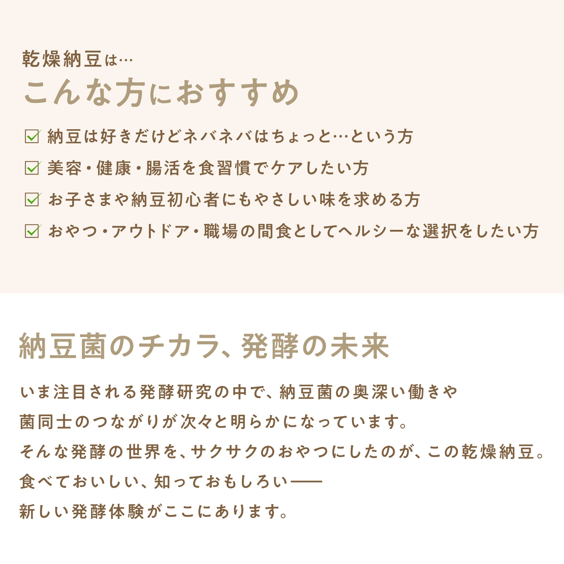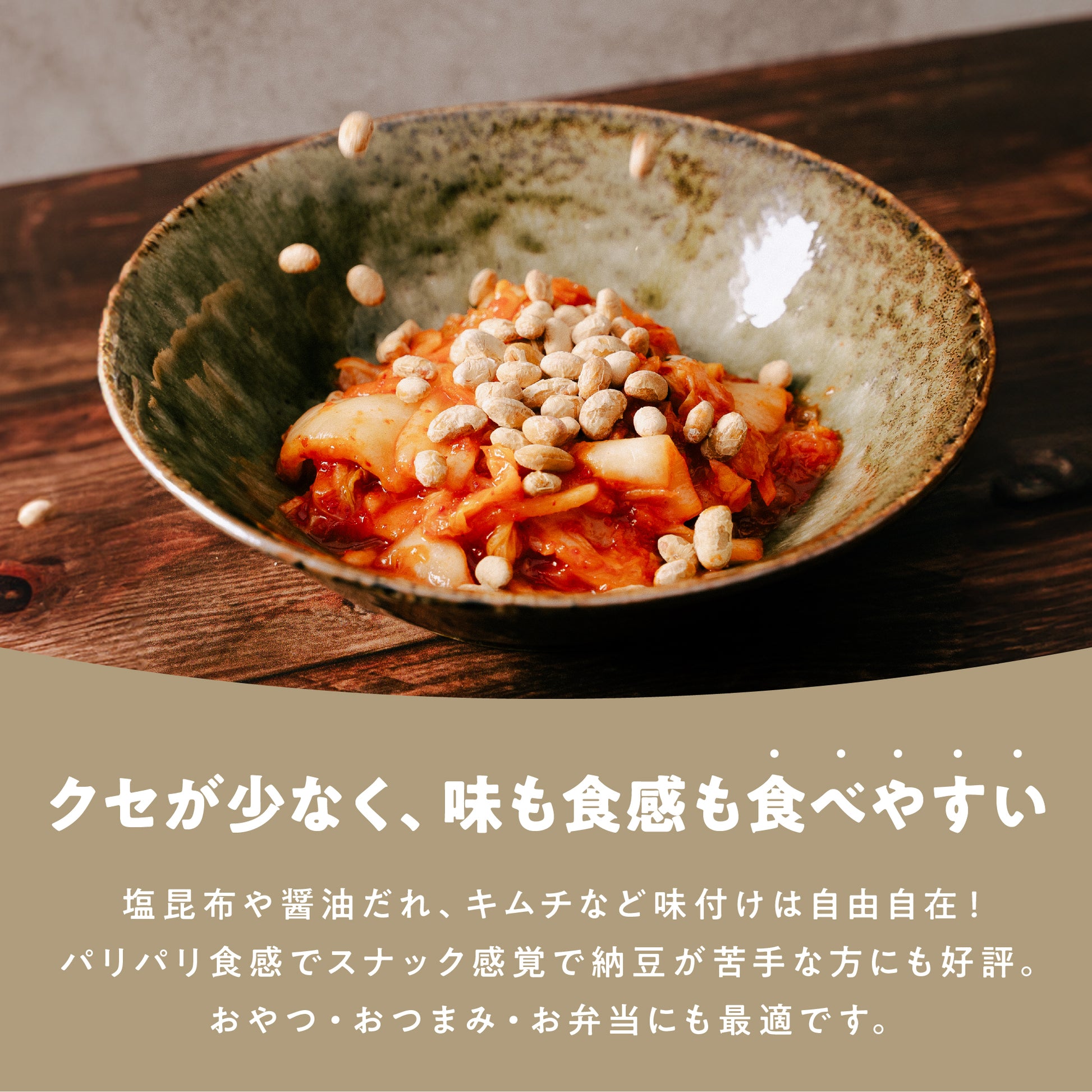 ・納豆のネバネバが苦手な方に:従来の納豆とは異なり、サクサクとした食感で、クセが少なく食べやすいのが特徴です