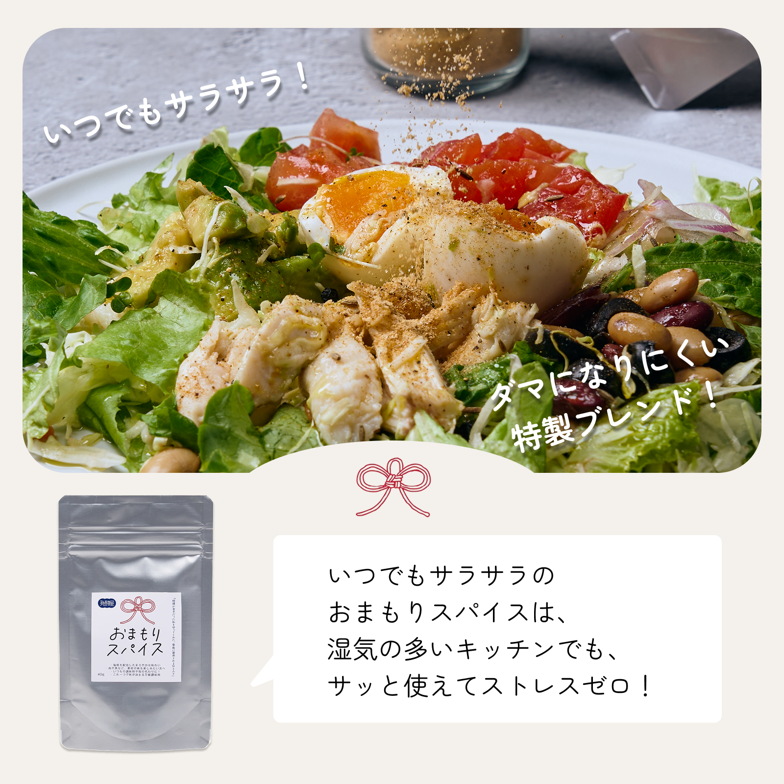 発酵研究のプロと共同開発された新しい発酵調味料。湿気にも強い特殊ブレンドで、いつでもサラサラ。湿気の多いキッチンでもダマになりにくく、サッと使えます。特殊製法でスパイスが固まる悩みを解消しました。